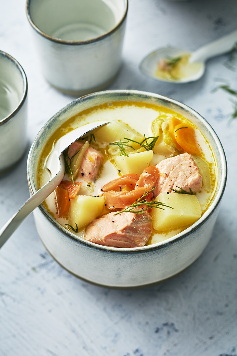 Cette soupe crémeuse de pommes de terre et saumon est un plat commun des pays nordiques qui réchauffe les soirées d’hiver.