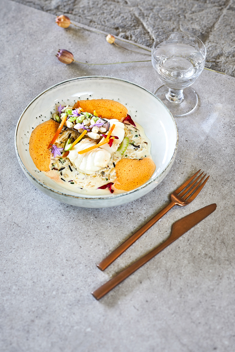 Lotte à l’armoricaine revisitée sur un risotto de couteaux et céleri