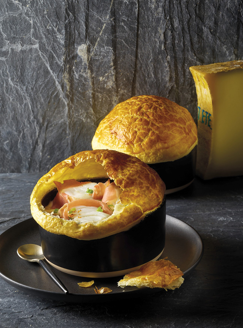 ⑦• Couvrir la cocotte de la pâte feuilletée, côté passé à l’œuf dessous. Souder en appuyant sur les bords. Dorer la pâte feuilletée avec le reste d’œuf battu. Parsemer du reste de Beaufort AOP.