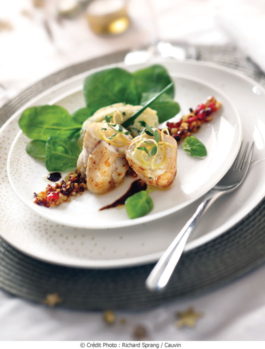 6• Préparer un écrasé de rattes à l’huile d’olive et le déposer en quenelles sur les assiettes avec quelques jeunes pousses d’épinards assaisonnées.
