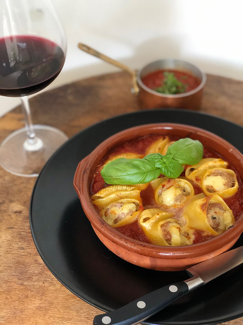 ④• Déposer la sauce italienne dans le fond du plat puis déposer dessus les lumaconi farcies et enfourner pendant 10 minutes à 180°C (Th.6).