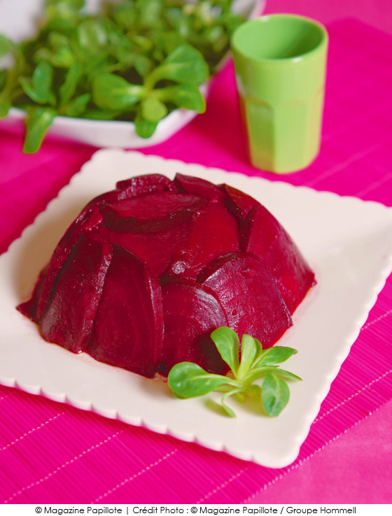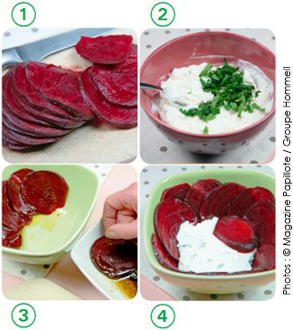 1• Tranche finement les betteraves. Mélange l’huile et le vinaigre dans une assiette pour y tremper une face des tranches les plus grandes. Recouvre les parois et le fond d’un moule avec les tranches, face sans sauce côté paroi. Réserve le reste de vinaigrette.