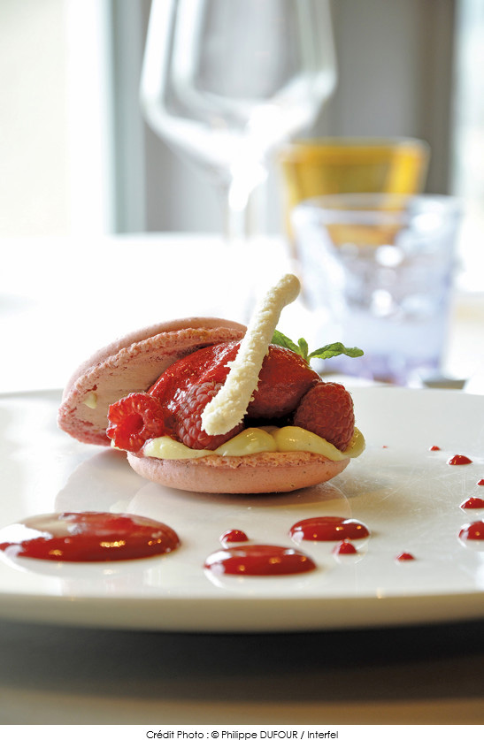 Macaron framboise, crème mousseline vanille et sorbet framboise