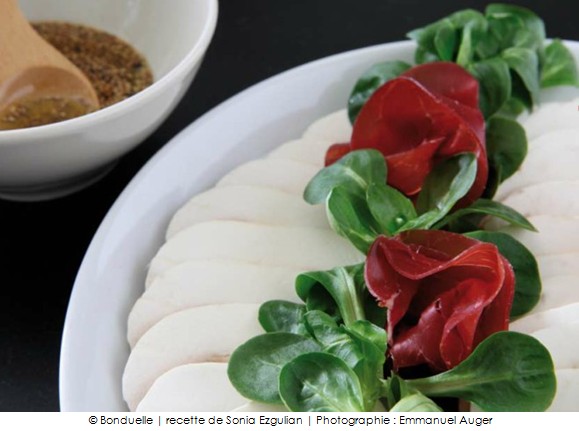 2• Je borde les champignons de jolis bouquets de Mâche Bonduelle puis je parsème de tranches de bresaola ou de viande des Grisons, froissées comme une pivoine.