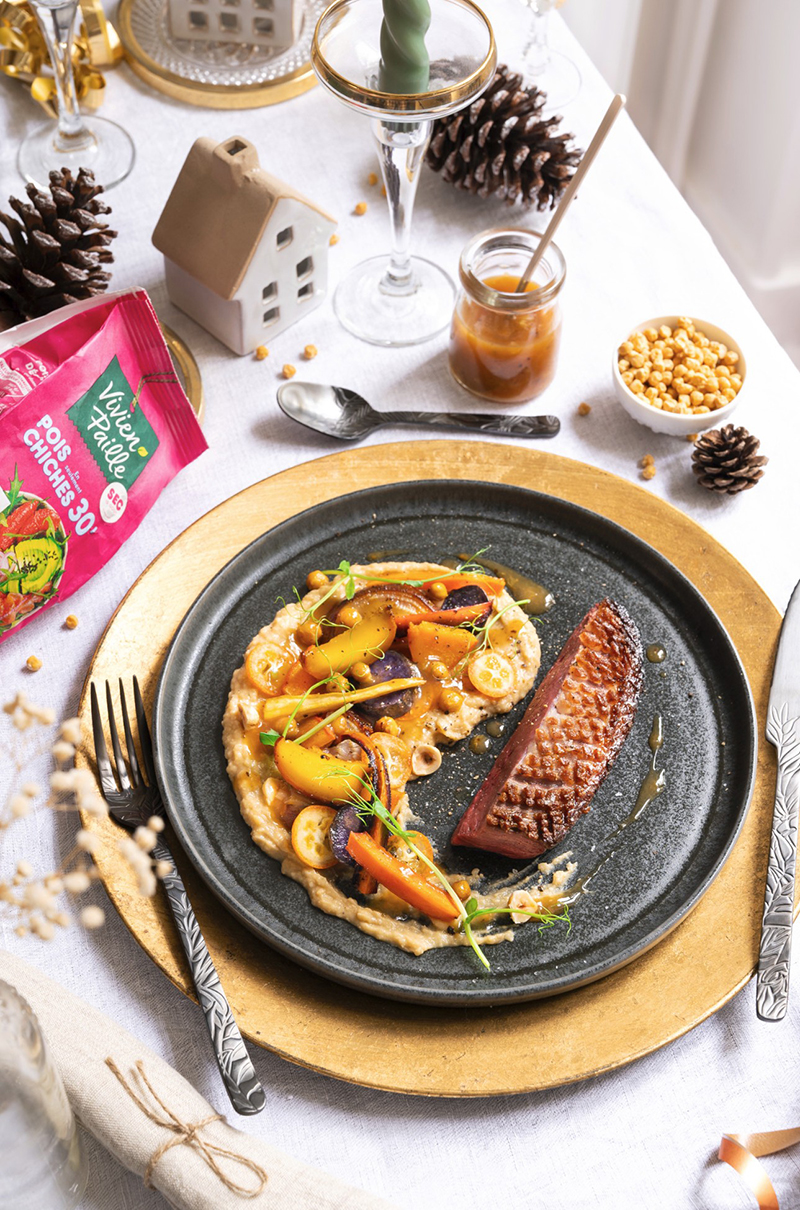 Magret de canard aux agrumes, houmous tiède et légumes rôtis