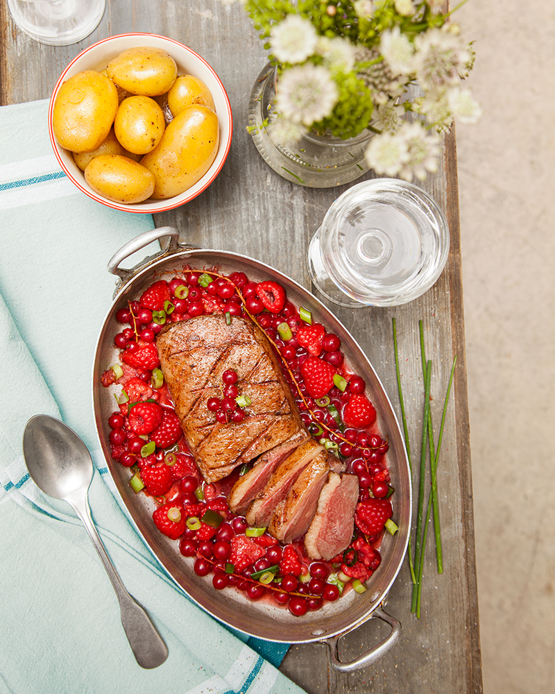Lorsque le magret est cuit, tranchez le et servez à l’assiette entouré des fruits rouges et des pommes de terre.