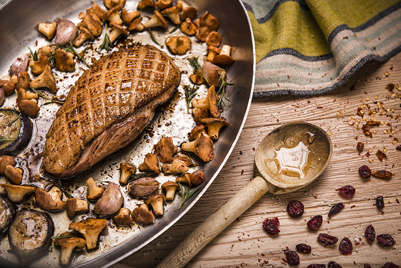③• À la poêle, colorez le côté peau du magret à feu vif puis faites cuire à 180°C au four pendant 15 minutes. Salez, poivrez et réservez au chaud.