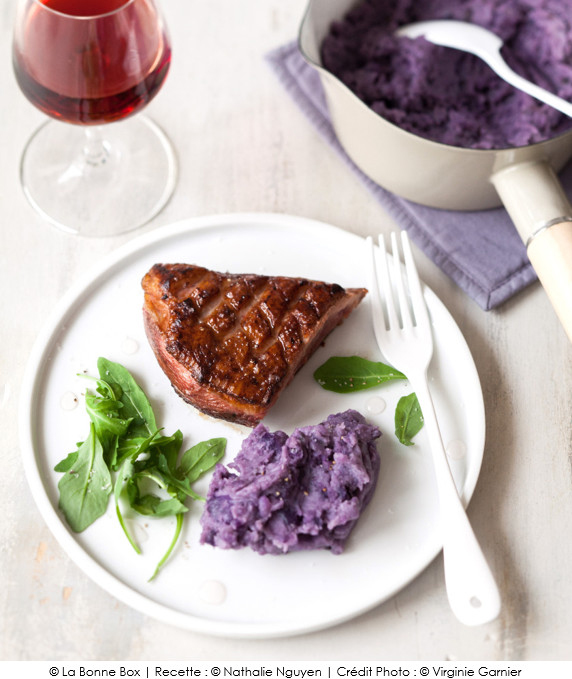 Servez-les avec la purée, et la roquette légèrement arrosée de graisse de canard au confit de violette restée au fond de la poêle.