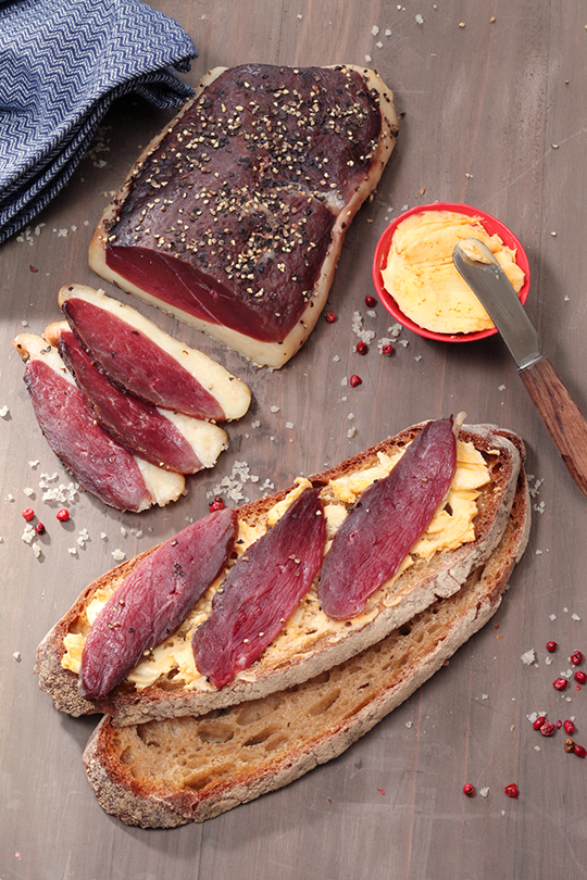 ④• À l’heure de l’apéritif, tartiner la tranche de pain Poilane de beurre à la sauce TABASCO® Chipotle, puis tailler de fines tranches de magret de canard cuit au sel, qu’il suffit de déposer dessus.