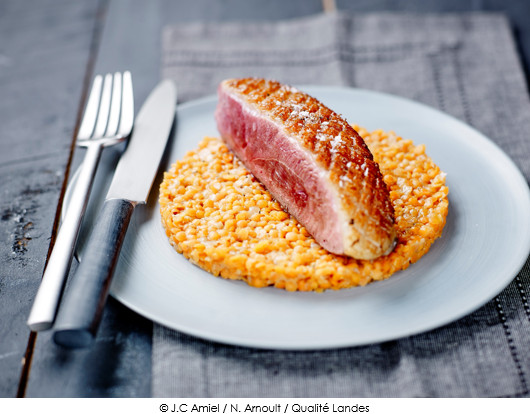 Magret de Canard Fermier des Landes fumé au foin, lentilles corail comme un risotto