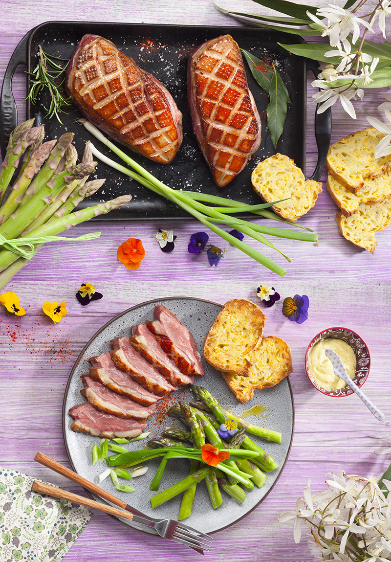 ⑥• Déposer les 2 Magrets sur la plancha coté peau et les faire dorer 10 min à doux en jetant la graisse plusieurs fois.