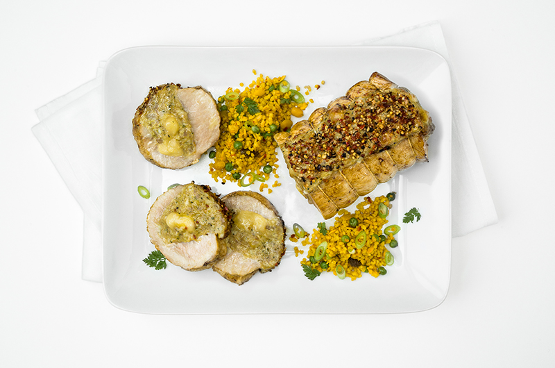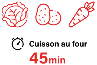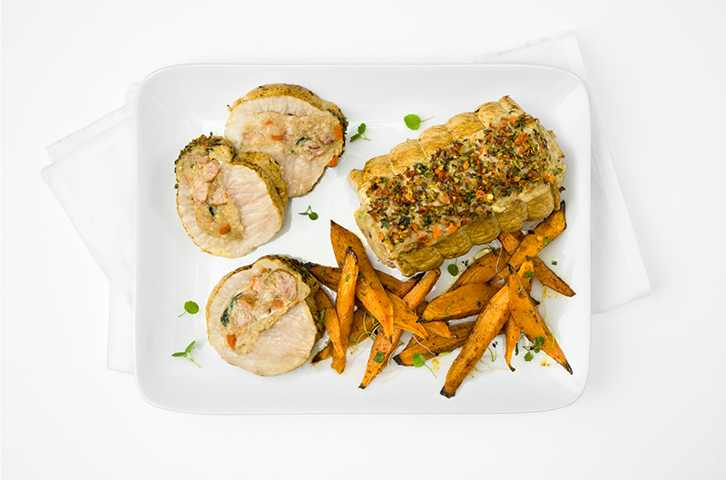 Dans une version plus traditionnelle, ce rôti de porc farci au chou vert, pomme de terre et carotte n’est pas sans rappeler le bon goût de la potée.
