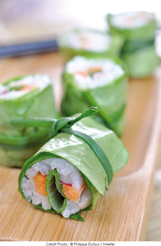 2• Déposer sur chaque demi-feuille de laitue en longueur un peu de riz bien cuit, quelques bâtonnets de carotte et de radis, un morceau de fane d’oignon et à nouveau un peu de riz. Réaliser des rouleaux bien serrés puis couper les rouleaux obtenus en tronçons de 4 à 5 cm. Entourer chaque bouchée d’un brin de ciboulette pour qu’elles restent bien fermées.