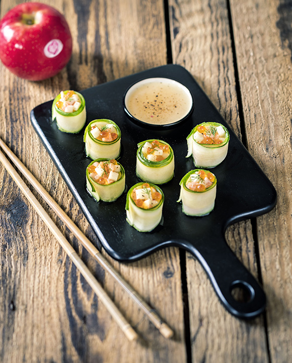 À l’arrivée de printemps et des températures plus douces, on opte pour une recette légère et fraîche avec des petits makis de concombre. Ils renferment en leur cœur un doux mélange de pommes Pink Lady® et de saumon mariné, la recette idéale pour épater ses invités !