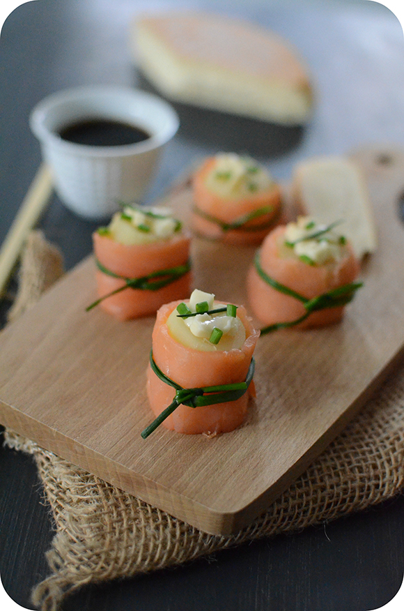 ⑤• Envelopper la pomme de terre d’une bande de saumon puis maintenir le tout avec un brin de ciboulette noué.