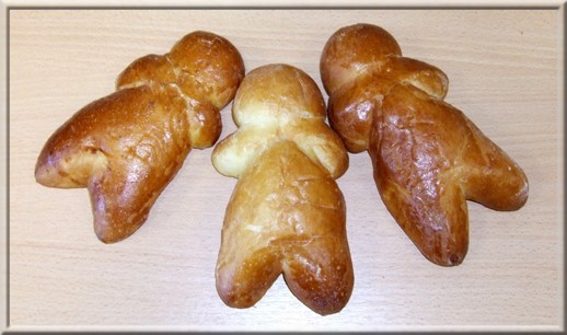 4.Pour confectionner les mannala prélevez des portions de pâte de 100g, roulez-les en saucissons de 15 cm de long et épais comme 2 doigts, façonnez le cou, puis entaillez la pâte au couteau ou ciseaux pour former les bras et les jambes