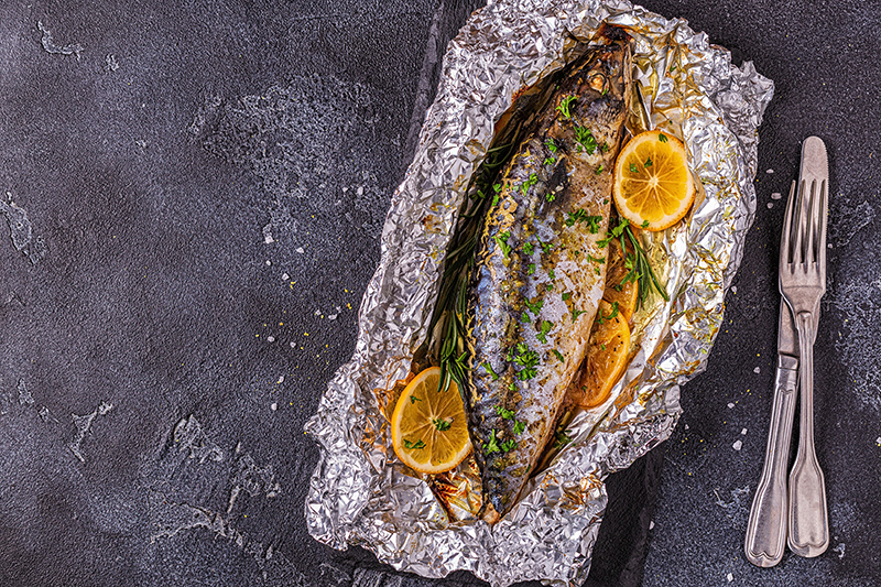 ②• Enveloppez individuellement les poissons en papillote dans du papier aluminium. Placez les maquereaux dans le four, proche du grill. Faites-les cuire 15 min et faîtes pivoter les poissons à mi-cuisson. Éteignez le four après 15 min et laissez les maquereaux 7 à 8 min dans le four éteint afin qu'ils soient cuits à cœur.