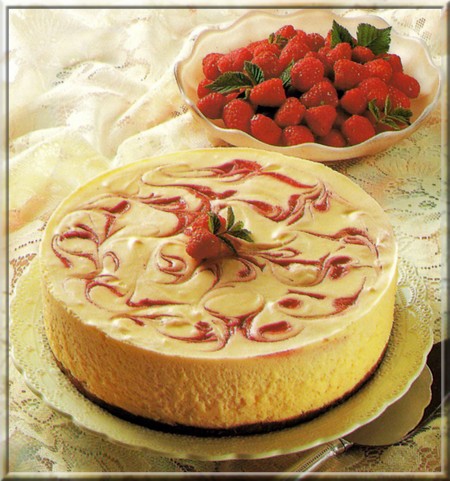 5• Éplucher les fraises, les réduire en purée. La répartir à la surface du gâteau. Avec les dents d'une fourchette, faire légèrement pénétrer la purée de fraises pour marbrer le gâteau. Placer au frais 3 h. Ôter délicatement le cercle extérieur du moule, faire glisser le gâteau sur le plat de service. Décorer avec les 3 fraises.