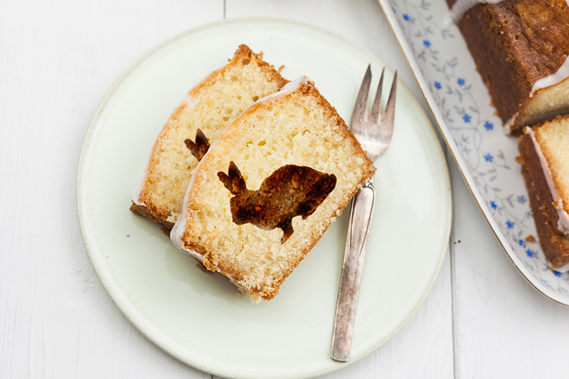 ⑦• Couper le gâteau en tranches épaisses et régulières, et découper dans celles-ci des lapins à l’aide du cookie cutter (l’emporte-pièce peut être congelé au préalable pour faciliter la découpe).