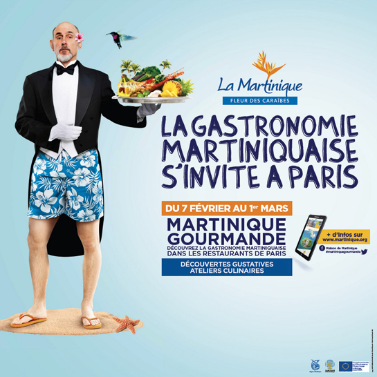 À cette occasion, une grande campagne de publicité sera révélée en affichage dans les métros parisiens, et via display sur mobiles géolocalisés. Elle incitera également les internautes à jouer sur le site évènementiel pour gagner un voyage en Martinique autour d’un quizz gourmand. Cette campagne se joue du cliché du maître d’hôtel parisien conservateur et se veut décalée, complice et humoristique pour interpeller les parisiens dans l’ambiance frileuse et pluvieuse. Cette invitation au voyage culinaire sera un fort relais d’attractivité pour la Martinique et ses différents atouts.