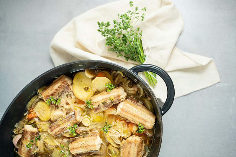 ④• Mettre dans le fond de la cocotte une couche de roussette puis une couche de lamelles de pommes de terre, d’oignon, de carottes et de poireau, du persil haché.