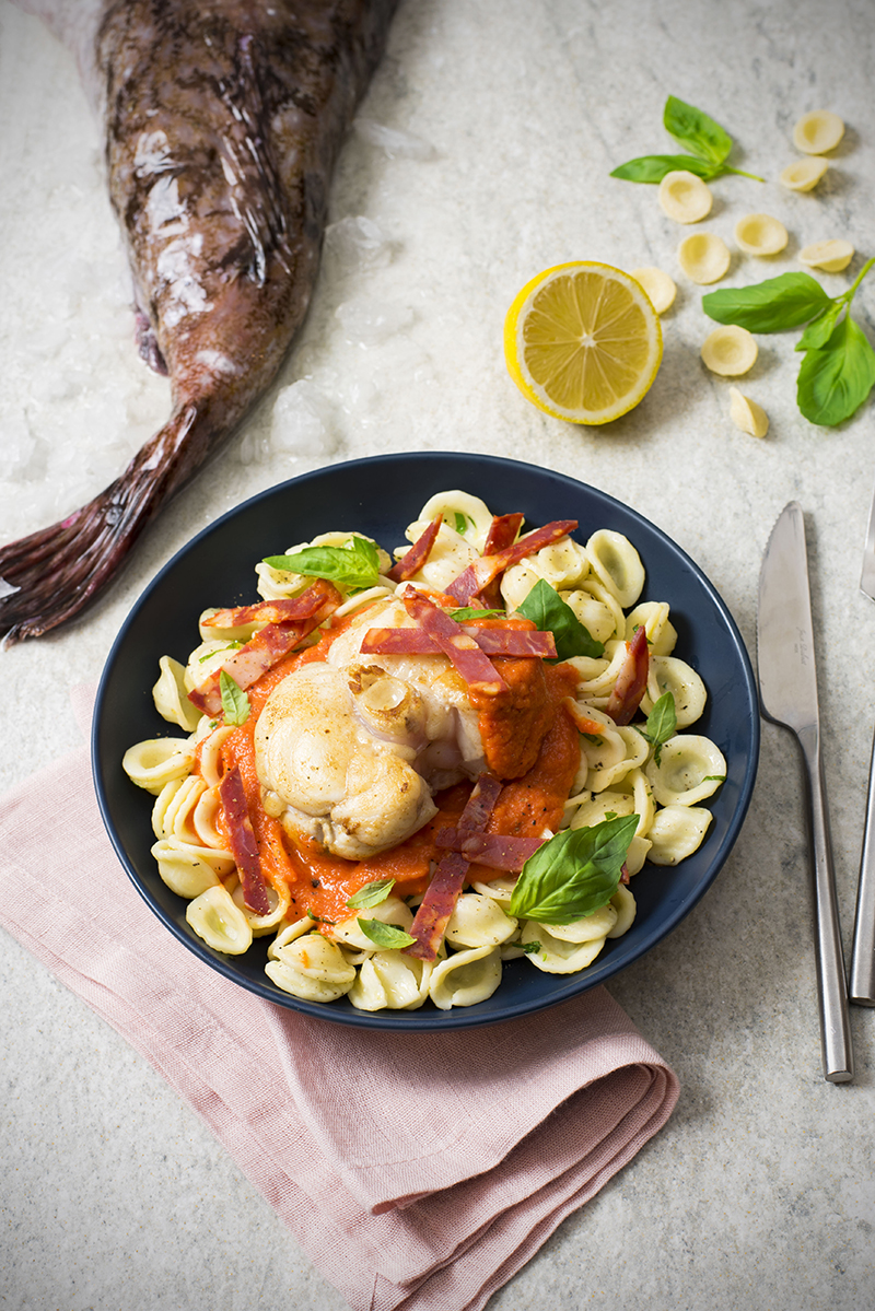 Médaillons de lotte au poivron rouge, chorizo et orechiette