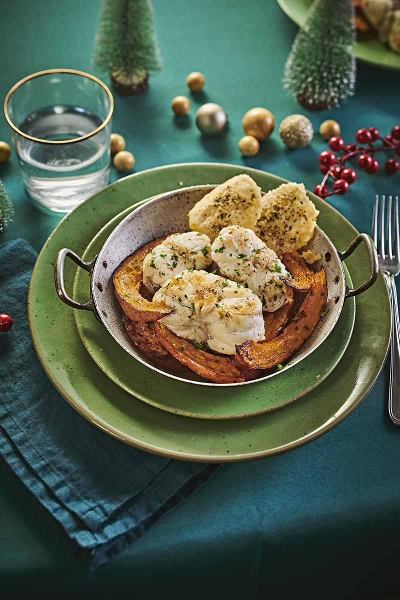 ⑤• Dans des cassolettes, placer les tranches de potimarron rôti et les médaillons de lotte.