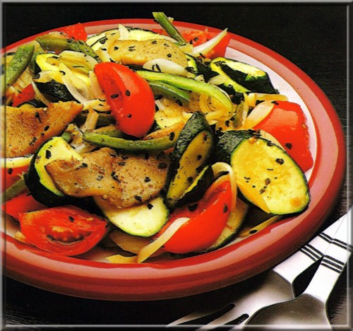4.Saler, poivrer, compléter avec basilic et tomates. Couvrir et laisser mijoter à feu doux 10 mn. Servir aussitôt.