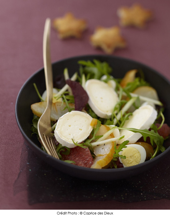 ⑤• Assaisonnez la salade avec le reste de vinaigrette, répartissez-la dans 4 assiettes creuses. Répartissez les quartiers de pamplemousse, les œufs de caille, les tranches de haddock, la pomme râpée et les morceaux de Caprice des Dieux sur la salade.