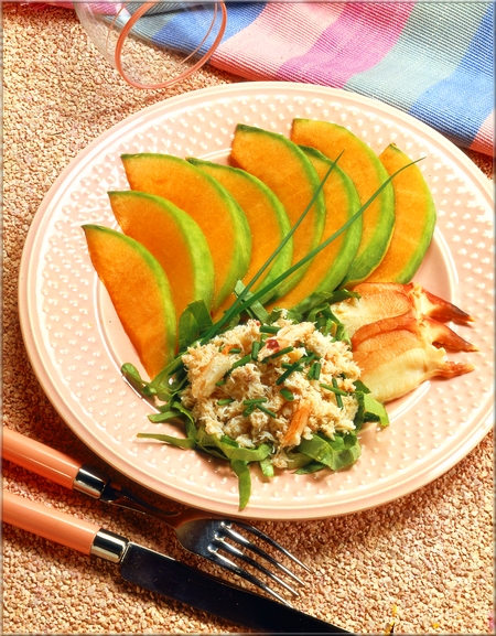 Disposer les tranches de melon dans chaque assiette. Décorer avec les pinces de crabe si le crabe est frais.