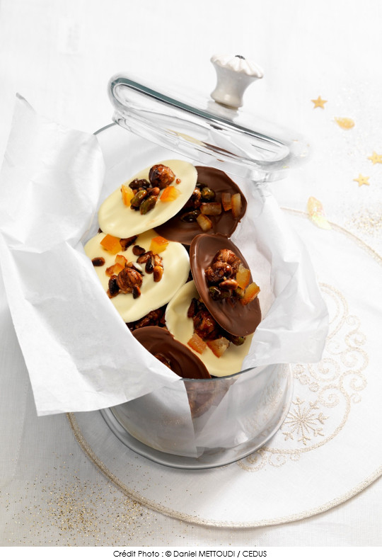③• À l'aide d'une cuillère, déposer des disques de chocolat très fins sur une plaque à pâtisserie recouverte de papier sulfurisé. Répartir sur les disques de chocolat des fruits secs et des morceaux d'écorces d’orange confites.