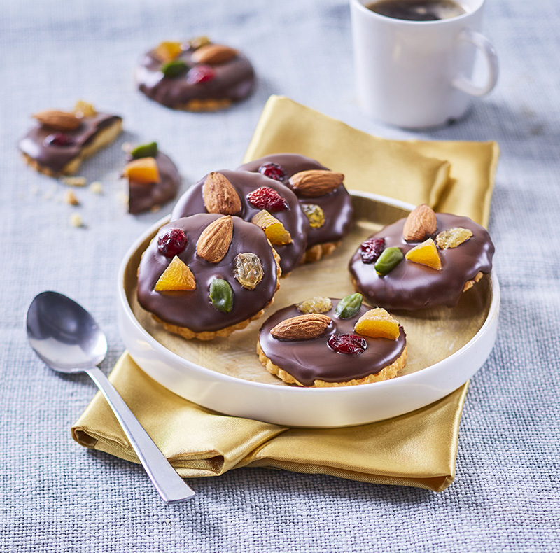④• Avant que le chocolat ne fige, déposer des fruits secs sur le dessus de chaque Galette.