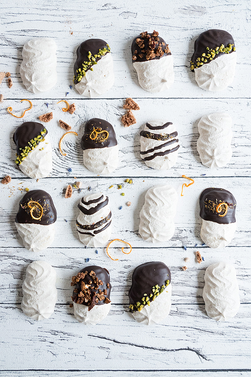 ⑥• Couper le chocolat, le faire fondre au bain marie puis enrober les meringues avec.