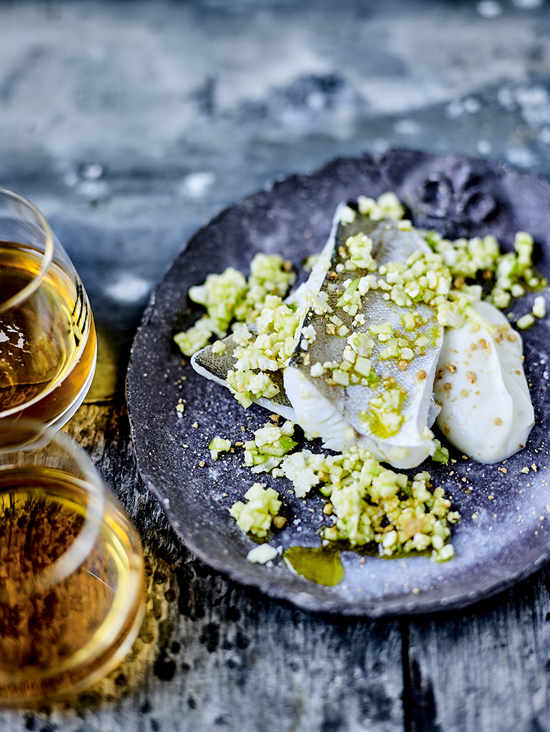 Servir avec la purée de chou-fleur et les filets de merlan et à déguster avec un cidre de Dégustation Loïc Raison bien frais.