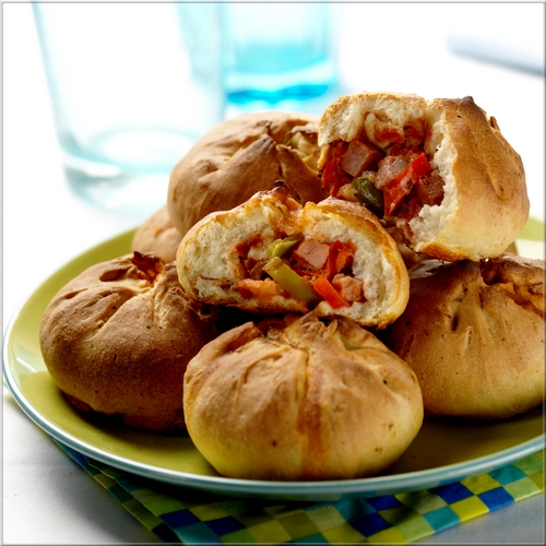 4• Je découpe le poivron en lamelles (pour un effet de couleur, je prends 1/4 de poivron vert et 1/4 de poivron rouge). Je prépare des dés de mozzarella. Je répartis la sauce tomate, les poivrons, les dés de jambon et de mozzarella dans le creux préalablement formé et les saupoudre de basilic. Je tire la pâte pour recouvrir la garniture.