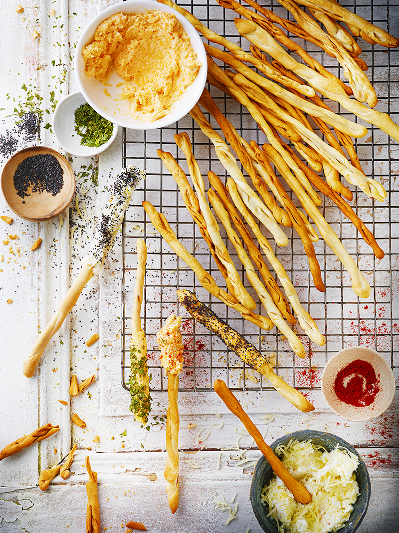 ②• Déroulez la pâte à pizza et coupez-la en lanières à l’aide d’un grand couteau ou d’une roulette à pizza. Prenez une lanière entre vos mains, étirez-la un peu, repliez-la en deux puis entortillez-la sur elle-même pour former un fin Mikado. Posez-le sur une plaque recouverte de papier cuisson et procédez de même pour tous les autres. Enfournez pour 10 minutes puis laissez refroidir sur une grille.