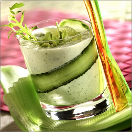 Appliquer les lanières réservées de concombre en spirale sur la paroi intérieure de 4 verres. Remplir avec le milk shake très froid et répartir en surface l’avocat au citron. Décorer d’une feuille de roquette et d’un trait d’huile d’olive.
