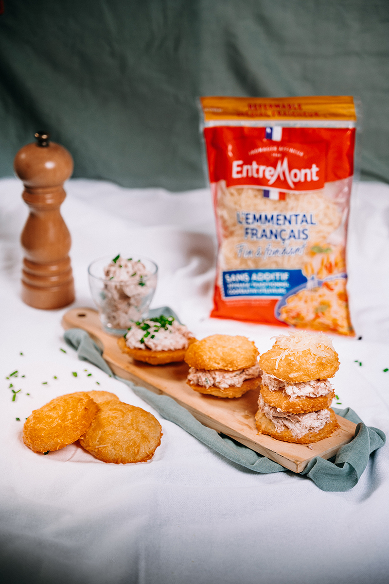 Inspirez-vous d’une recette issue de la pâtisserie, ajoutez-y des galettes complètes fourrées à la mousse de thon… Et parsemez le tout d’un peu d’Emmental français râpé Entremont pour obtenir la recette gourmande de Virginia : simple, efficace et incroyablement gourmand.