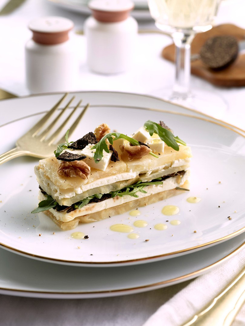 Mille-feuille de Chaource, céleri confit, truffe et roquette