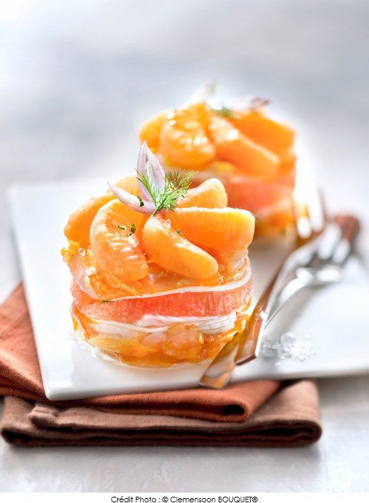 ⑥• Dans des cercles de présentation montez les mille-feuilles en alternant fenouil, haddock, fenouil, pamplemousse, fenouil et haddock. Arrosez d’un peu de sauce citronnée puis disposez les quartiers de Clemensoon® par-dessus. Arrosez à nouveau d’un peu de sauce.
