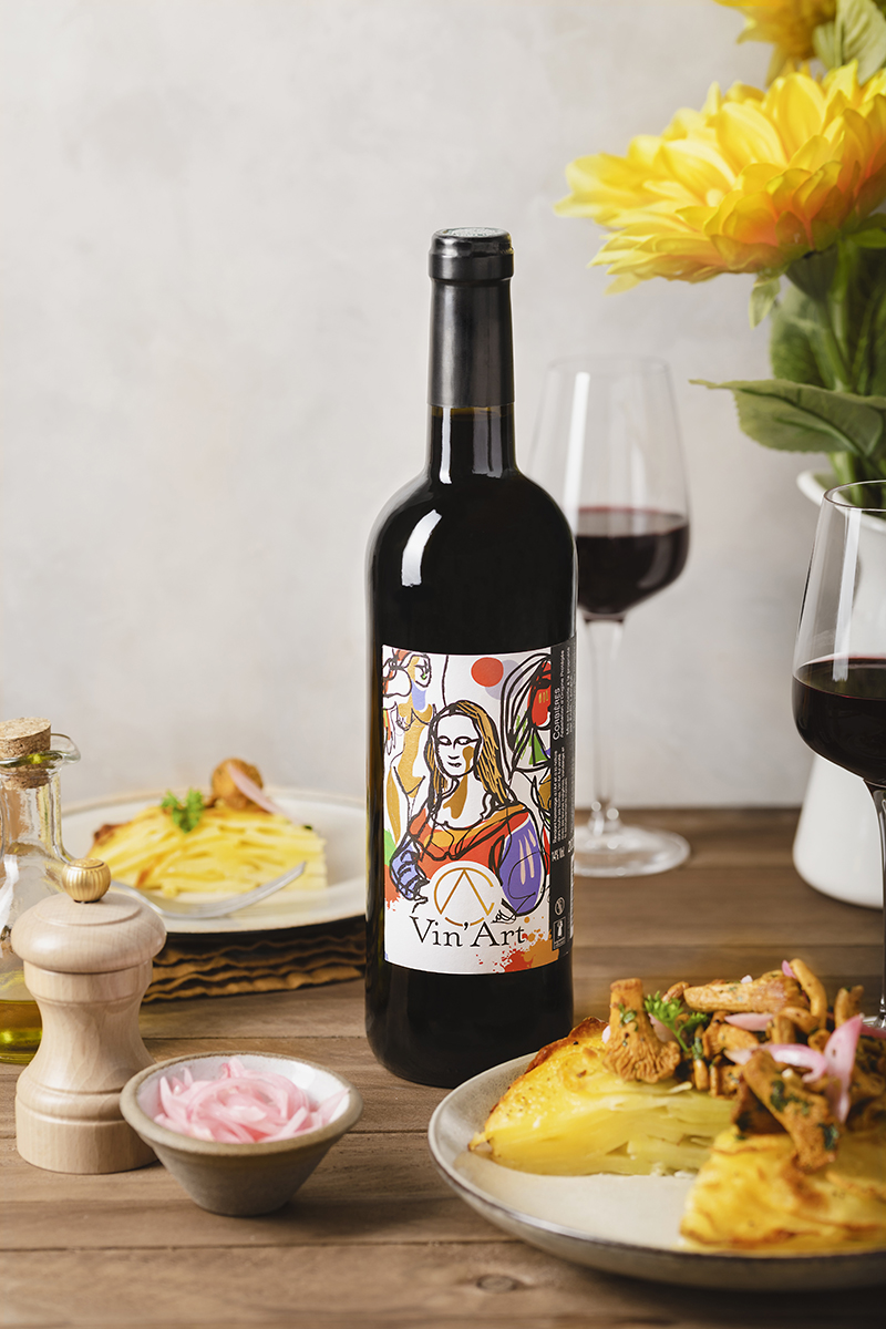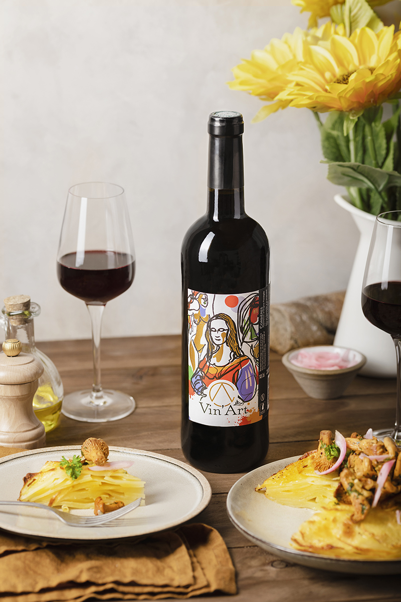 À l’allure raffinée et harmonieuse, Vin' Art se présente avec un goût d’authenticité et des arômes naturels. Vêtue d’un robe rouge cerise, cette cuvée se dévoile avec un nez doux aux notes de fruits rouges. En bouche, c’est un vin rouge qui s’exprime tout en rondeur, par ses belles notes fruitées. À accorder avec des plats du quotidien, Vin' Art se dégustera parfaitement avec cette belle recette aux couleurs de l’automne : le mille-feuille de pommes de terre, champignons des bois et pickles d’échalote.