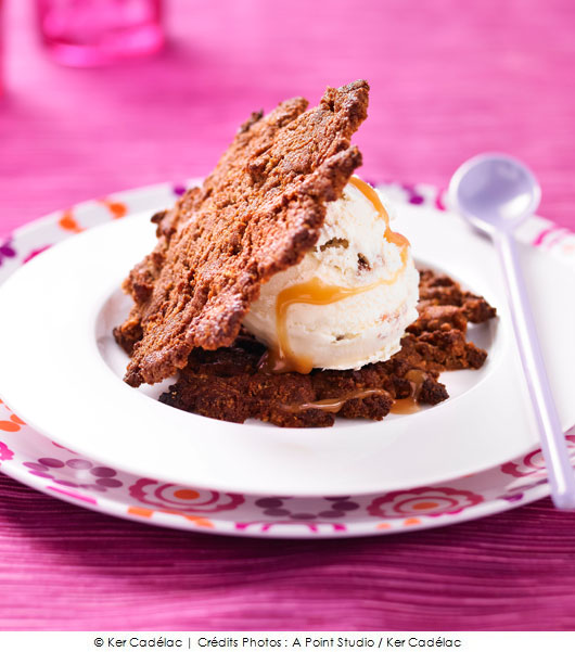 5• Au moment de servir, dresser une dentelle de Quatre-quarts, une quenelle de glace et recouvrir d’une deuxième dentelle de Quatre-quarts. Napper de caramel au beurre salé.