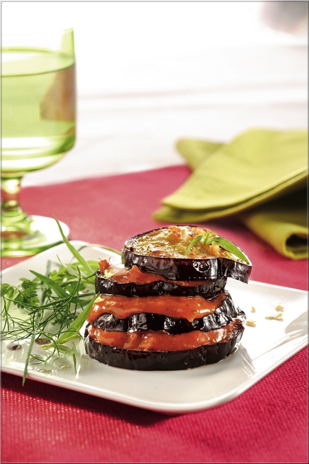 5• Lorsque les tranches d’aubergine sont cuites, les retirer du four, tartiner une face de sauce Tikka Masala Patak’s et les superposer en terminant par une couche de sauce.