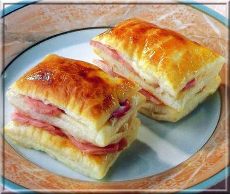 2.Étaler la pâte feuilletée et la couper en rectangle de 5 cm sur 3 cm. Sur un rectangle, étaler une bonne cuillerée de sauce au jambon, puis recouvrir le tout avec un second carré de pâte. Répéter l'opération avec les autres rectangles.