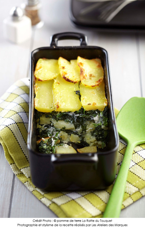 ⑤• Dans le plat, disposez une couche de Ratte du Touquet puis ajoutez une couche d’épinards. Recommencez l’opération en finissant par une couche de Ratte du Touquet.
