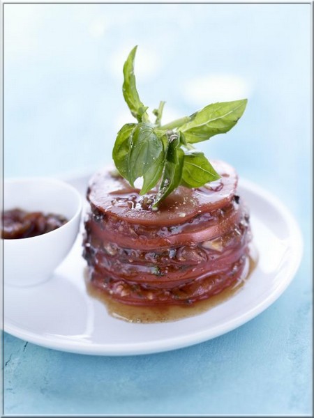 7- Couper les tomates en tranches puis les reconstituer en intercalant chaque tranche avec une cuillère à café de chutney.