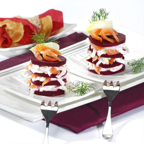 Montez les mille-feuilles en alternant la betterave, la préparation fromagère, les endives en julienne et les lanières de saumon.