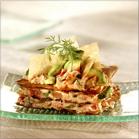 Monter les millefeuilles en commençant par un rectangle de feuilleté, disposer dessus de lamelles d’avocat et étaler ensuite la crème de crabe. Recommencer dans le même ordre et finir par un rectangle de feuilleté décoré avec une feuille de menthe ou un brin d’aneth.