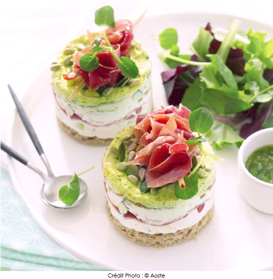 Millefeuille de Jambon Serrano Aoste au fromage frais et pesto