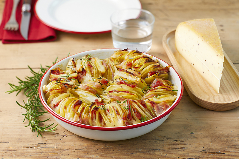 Millefeuille de pommes de terre, fromage à raclette à la truffe d’été et lard fumé au thym et romarin